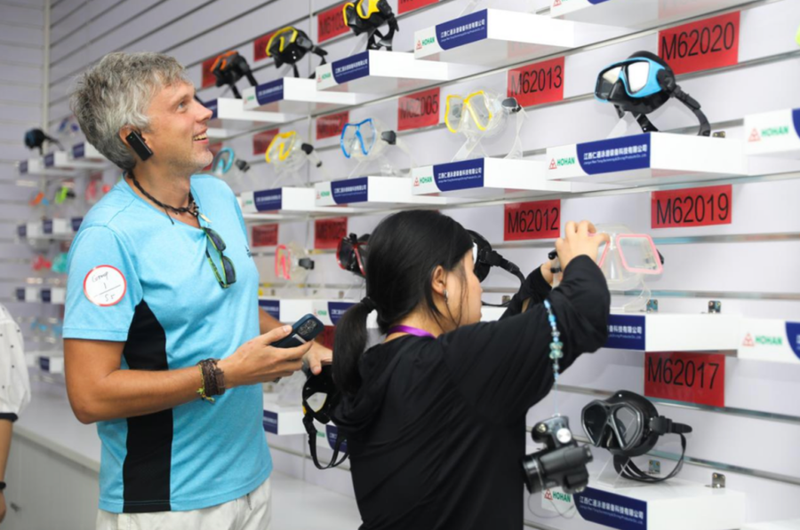 国外采购商在江西仁通泳潜装备科技有限公司了解泳潜产品。龚声伟 摄
